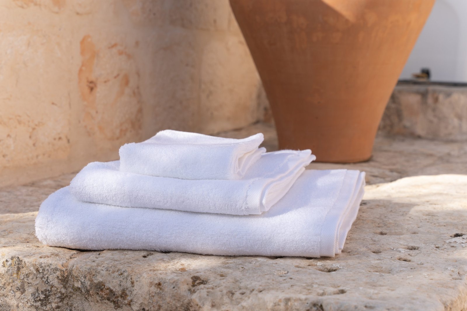 Peshqirët prej terri 520gr/m2, prej pambuku të bardhë të pastër me një skaj piqué 2 cm , janë ideale për hotele, B&B, spa, ferma bukurie, lavanderi dhe institucione shëndetësore që duan të përdorin li të thjeshtë por elegant.